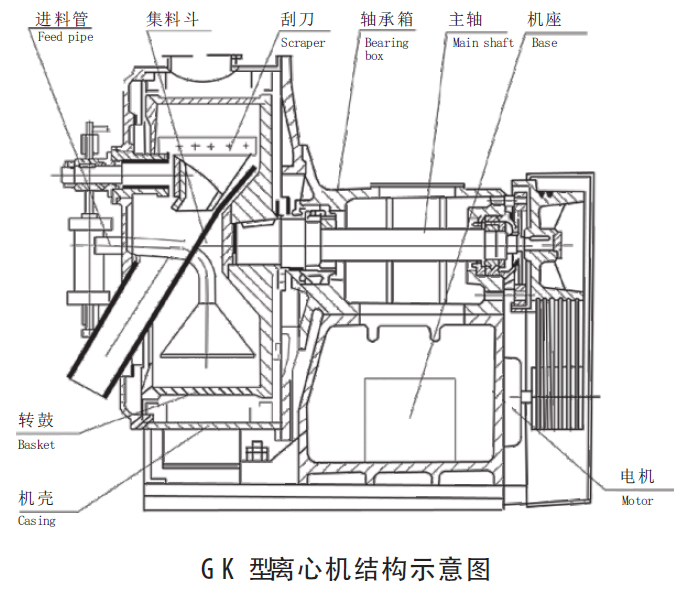 主電機(jī)帶動轉(zhuǎn)鼓全速旋轉(zhuǎn),物料由進(jìn)料管引入。在離心力作用下,液相物穿過濾網(wǎng)及轉(zhuǎn)鼓壁濾孔排出轉(zhuǎn)鼓,經(jīng)排液管排出機(jī)外,固相物截留在轉(zhuǎn)鼓內(nèi),形成環(huán)形濾餅層。進(jìn)料達(dá)到預(yù)定容積后停止進(jìn)料,進(jìn)一步分離,同時(shí)可進(jìn)行洗滌。洗滌、分離結(jié)束,刮刀自動旋轉(zhuǎn),將固相物刮下經(jīng)集料斗排出機(jī)外,然后自動洗網(wǎng),開始下一個(gè)循環(huán)。